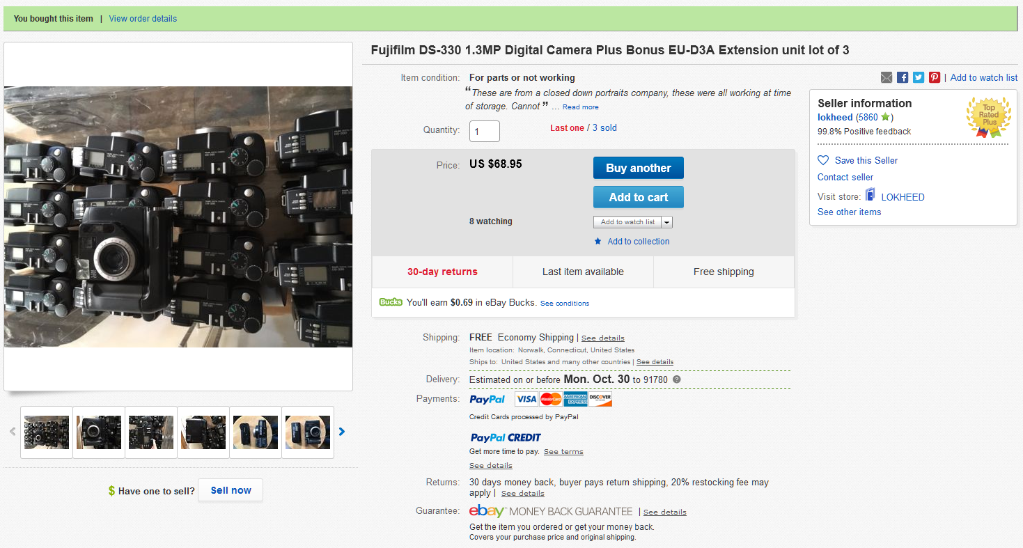 I bought a lot of 3 Fujifilm DS-330 cameras. I had been looking for these rare cameras for a while now. They interest me because of their size and performance. These cameras cost over $2k at the time (1998) [1] and were professional solutions for photographers, interfacing with EVFs, PCs through SCSI, printers and GPS units. The camera was the successor to the DS-300 which shared a CCD sensor with the Fujix DS-505/Nikon E2 DSLR [2].