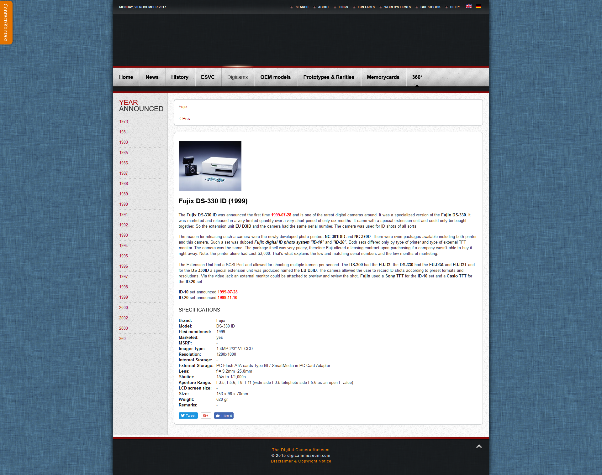[3]C. Photo, D. Cameras and D. 3, "Fujifilm DS-330 1.3MP Digital Camera Plus Bonus EU-D3A Extension unit lot of 3 10050332296166 | eBay", eBay, 2017. [Online]. Available: https://www.ebay.com/itm/Fujifilm-DS-330-1-3MP-Digital-Camera-Plus-Bonus-EU-D3A-Extension-unit-lot-of-3/253187867220?ssPageName=STRK%3AMEBIDX%3AIT&_trksid=p2057872.m2749.l2649. [Accessed: 23- Oct- 2017].